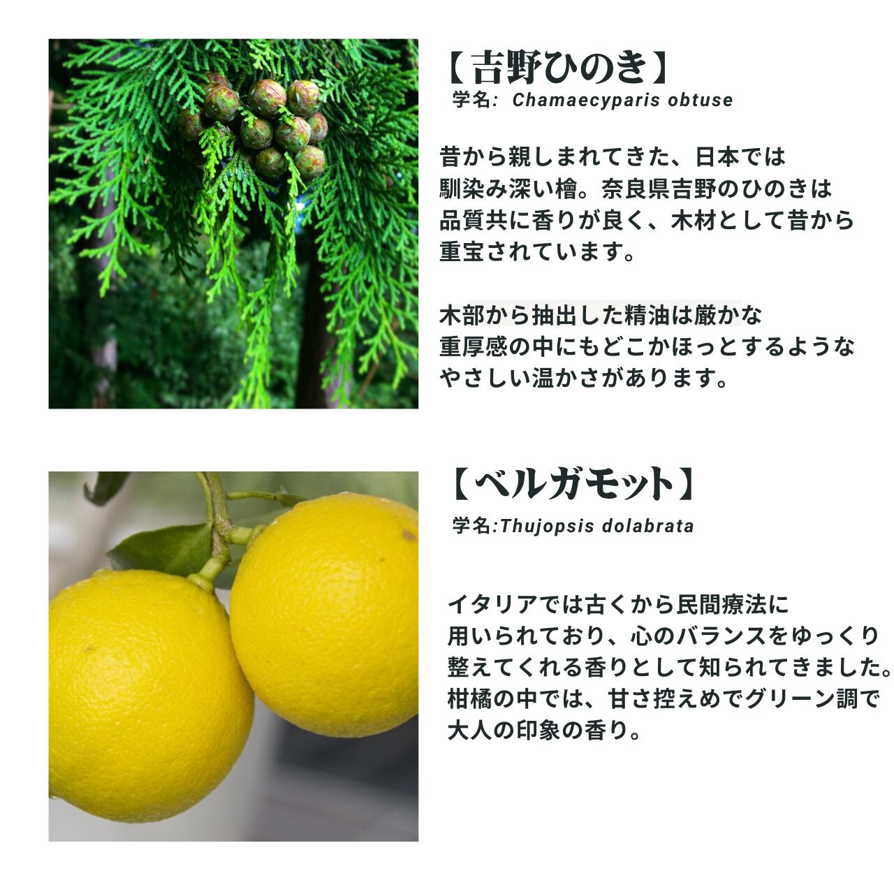 吉野ヒノキ(国産)、ベルガモット、ホーウッドなど