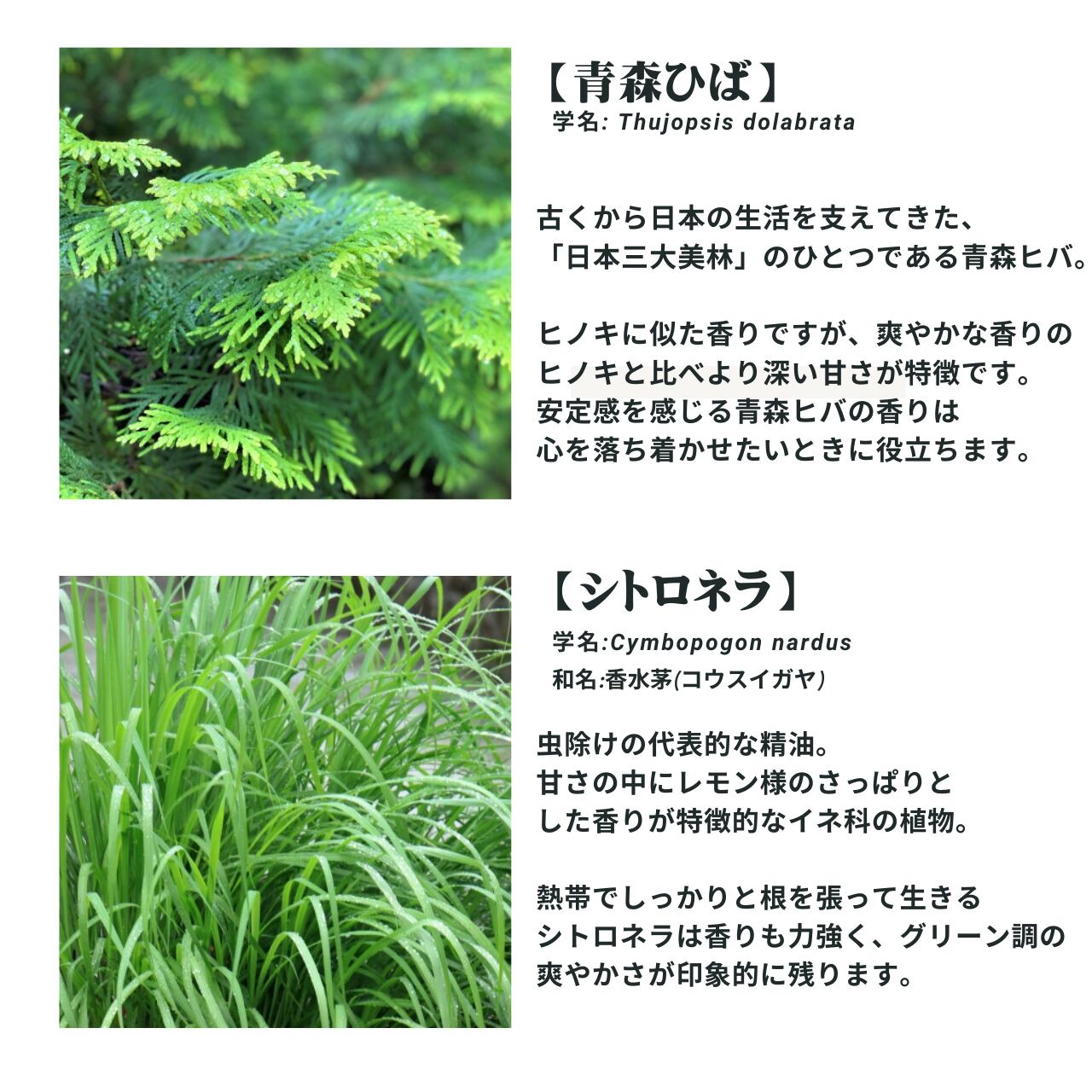 シトロネラ、青森ヒバ(国産)、オレンジスイートなど
